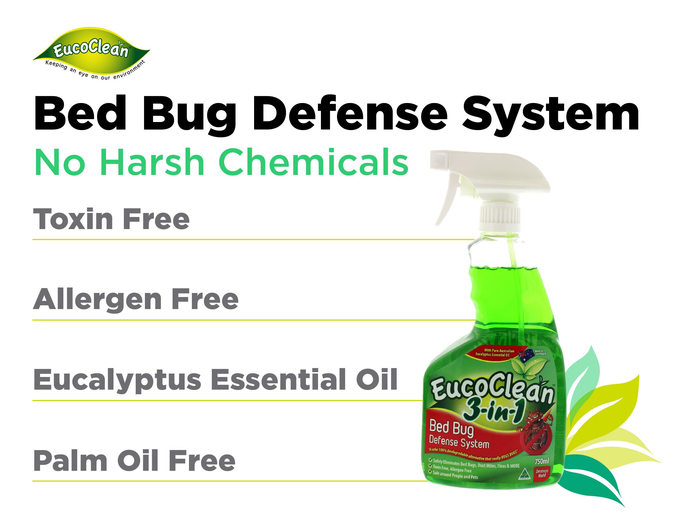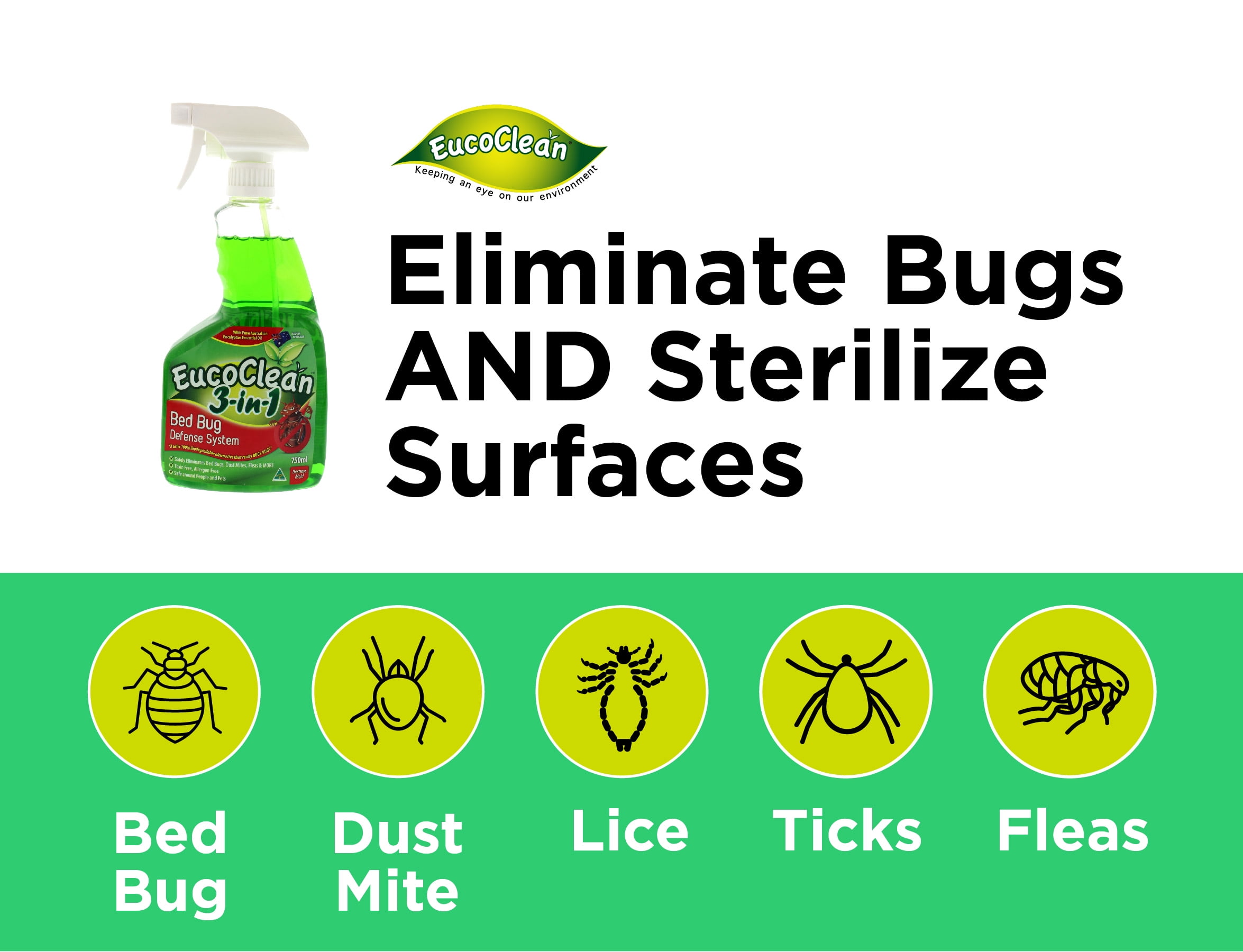 Eucoclean Natural Bed Bug Spray 25oz - Safely Eliminate Bed Bugs Fleas Dust Mites Ticks and More - Fast and Effective A Non-Toxic and Eco-Friendly Treatment for Home Bedding Carpets and More Show product reviews. Formulated with eco-friendly ingredients the 3-in-1 bed bug spray uses natural eucalyptus essential oil to eliminate insects. In this post we take a closer look at this product and learn more about its effectiveness and results so that you know what you can expect from it.