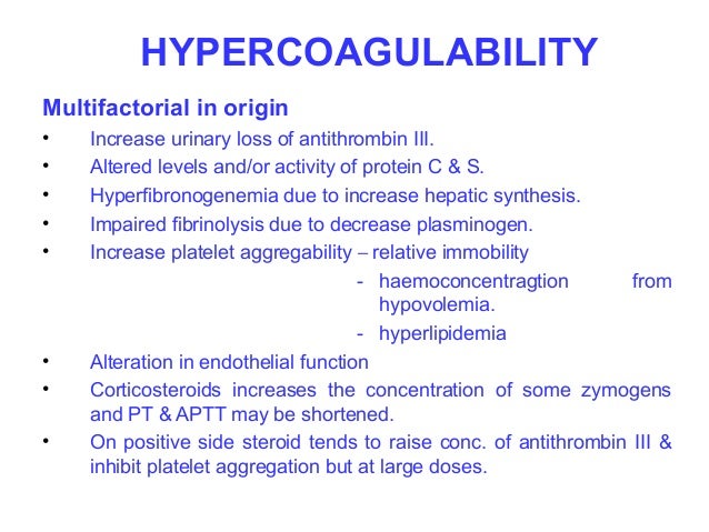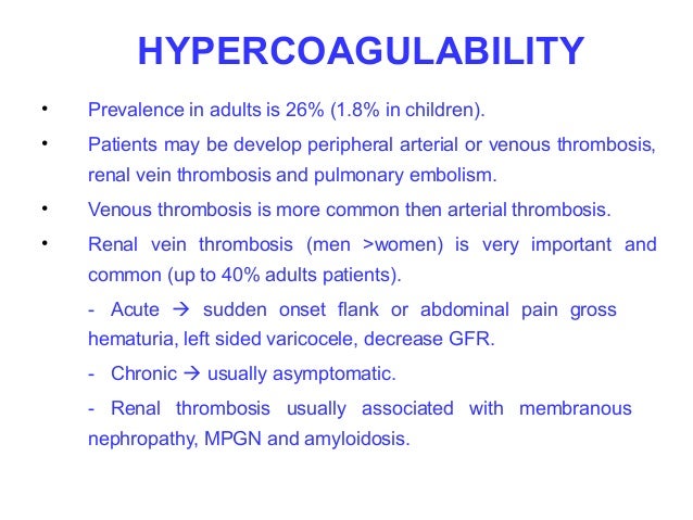 This topic will review the epidemiology and pathogenesis of hypercoagulability in the nephrotic syndrome and the prevention of thromboembolism in patients with nephrotic syndrome. 13 rows The linear regression analysis for hypercoagulability in MN patients showed that hypoalbuminemia. After infections thromboembolism is considered by many experts to be the most significant life-threatening complication of nephrotic syndrome.