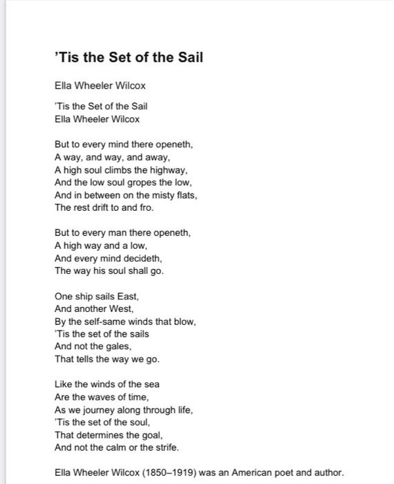 Ella Wheeler Wilcox. Tis the set of the sails. Like the winds of the sea Are the waves of time As we journey along through life Tis the set of the soul That determines the goal And not the calm or the strife.